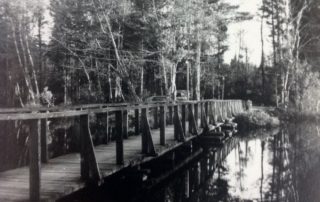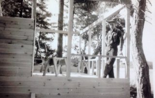 After the war ended, Charles got his chance. In November, 1945, Frank sold a small island a little west of his camps to Charles and Wilma. In the spring of 1946, Charles got to work, felling the pine trees on the land, taking the logs to a local sawmill where they were milled into lumber, and then brought the lumber back to build his first two camps, which would become #101 and #102, the two on the western (left) side of the causeway. Charles designed and built them himself, with help from Frank and several other workers. Oh, and he had to build the causeway to the mainland – wooden at first and then changed to cement in the mid-fifties. The camps were barely ready in time. The first guests, the grandparents of Tom Doviak (proprietor and chef at present day Tom’s Homestead Restaurant), had to walk over the still wet cement steps on a wooden plank. After the summer guests left in the fall of 1946, Charles wasted no time and built cabin #103, just to the right of the causeway. Construction of cabin #104 followed in the fall of 1947. The latter was the smallest of the cabins, due to the constraints of the land. Frank sold Charles and Wilma another parcel of land in December 1947 and in the fall of 1948, Charles built #105, the most westerly cabin on the mainland (which I own today). Over the next few years, three more cabins were built (# 106-108). Frank transferred ownership in 1957 to Charles and Wilma of what would be cabins #109 & #110 (now owned by the Magg family).