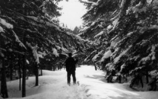 Charles Stone snowshoeing camp road, circa 1952